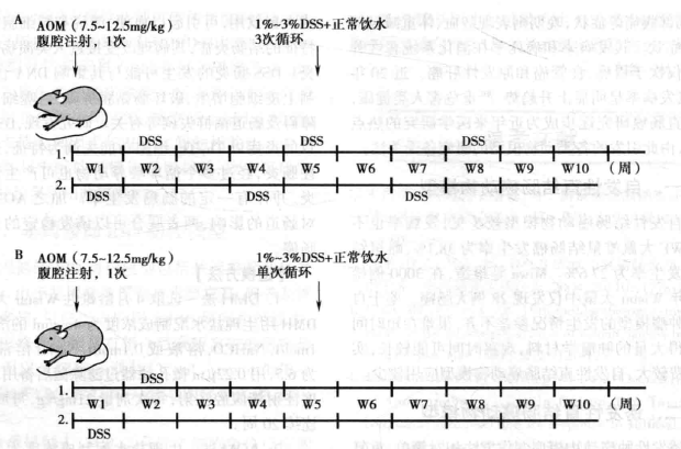 2.AOM法 ①連續(xù)4周腹腔注射氧化偶氮甲烷10mg/kg為最佳的給藥劑量,此最佳劑量與動物的飼養(yǎng)環(huán)境無關(guān),劑量過高會導致動物死亡率升高,劑量過低會導致癌癥程度較輕,不同的致癌劑最佳劑量取決于實驗動物遺傳背景和給藥方式。②每周腹腔注射氧化偶氮甲烷10mg/kg,連續(xù)4周,在第24周發(fā)生結(jié)腸癌的概率為100%。③不同遺傳背景小鼠對AOM的敏感程度不同,敏感性由強到弱的順序為:BALB/C小鼠與ICR小鼠有相同的作用,對氧化偶氮甲烷最敏感,C57BL/6N小鼠其次。④AOM誘導小鼠大腸癌的發(fā)生是一個長期的多階段的過程,與人類大腸癌發(fā)生過程中細胞動力學病理組織學和分子特征方面的變化特點非常相似。
