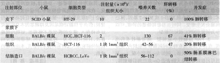 1. 皮下移植瘤模型 建立皮下移植瘤模型操作最簡單,成瘤率高,可方便實時監(jiān)測腫瘤的生長情況和評估治療效果,但是很難真實模擬人CRC的原位生長情況,使其難以表現(xiàn)出惡性腫瘤侵襲和轉移的特性;但是,也有SCID鼠皮下瘤發(fā)生肺轉移的報道,而原位的細胞和組織移植則更好地彌補了這一點。