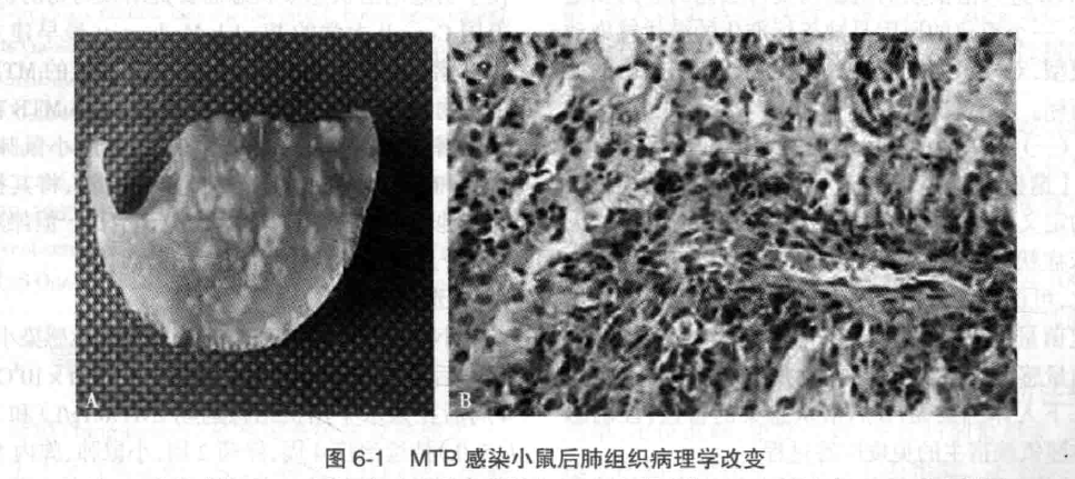 小鼠:不同品系小鼠由于其遺傳特性的不同,其對結(jié)核分枝桿菌H37Rv株敏感性也不同。如BALB/c和C57BL/6小鼠對H37Rv敏感性是DBA/2和C3H/HeJ小鼠的2倍,目前常用BALB/c和C57BL/6小鼠復(fù)制MTB感染模型。小鼠尾靜脈接種1×106CFU H37Rv標(biāo)準(zhǔn)毒株,2周后即可出現(xiàn)體重下降,狀態(tài)萎靡,剖檢發(fā)現(xiàn)肺部有明顯的肉芽腫形成(圖6-1A/文末彩圖6-1A),H&E染色后發(fā)現(xiàn)肉芽腫組織由大量上皮細(xì)胞和淋巴細(xì)胞組成,部分肺組織壞死,紅細(xì)胞滲出明顯,大量淋巴細(xì)胞和泡沫細(xì)胞聚集在支氣管及血管周圍(圖6-1B/文末彩圖6-1B)。小鼠脾、肺臟器研磨進(jìn)行CFU計數(shù)能獲得較高的荷菌數(shù)。為了更好地模擬MTB的感染途徑,也有采用氣霧發(fā)生器通過呼吸道感染。霧化感染實驗的最適條件為5ml霧化液(細(xì)菌+生理鹽水)霧化90分鐘,霧化吸入MTB數(shù)以106CFU為最佳,小鼠可出現(xiàn)明顯的結(jié)核肉芽腫病變,部分呈現(xiàn)壞死性改變。
