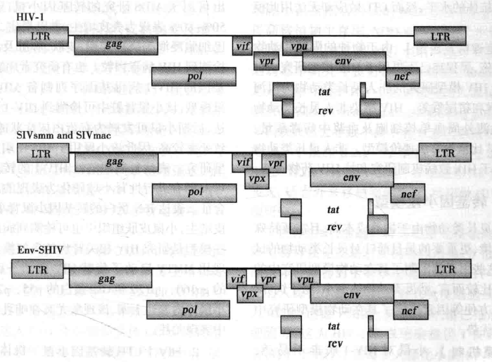 黑猩猩(chimpanzees)的遺傳特性在眾多非人靈長類動物中與人類最為接近,基因組序列同源性和人有較高的相似性,因此HIV-1病毒可選擇性地感染黑猩猩免疫細(xì)胞建立HTV-1急性感染模型。猴免疫缺陷病毒(simian immunodeficiency virus,SIV)是20世紀(jì)80年代從猴子體內(nèi)分離到可引起猴AIDS樣病變的病原體,根據(jù)其自然宿主不同,SIV可分為來自于恒河猴的SIVmac、來自于白眉猴的SIVsmm及來自于豬尾猴的SIVmne。SIVsmm是三種病毒的共同祖先,SIVsmm在其宿主體內(nèi)并不致病,僅可觀察到病毒血癥,因此以SIV感染其自然宿主并不能作為致病性動物模型使用。但如果將SIV接種到多個品種的亞洲猴(如恒河猴、豬尾猴及食蟹猴等)則可引起這些動物產(chǎn)生AIDS樣病變。常用SIVmac251和SIVmac239毒株感染恒河猴以復(fù)制HIV動物模型,恒河猴感染SIV成功后與人HIV-1感染過程相似,可引起疾病逆轉(zhuǎn)及CD4+T細(xì)胞進(jìn)行性下降,尤其是腸相關(guān)組織淋巴結(jié)CD4+T細(xì)胞數(shù)量下降更為明顯,但SIV感染的恒河猴AIDS病程發(fā)展進(jìn)程比人感染HIV-1要快。由于SIV與人HIV-1的差異性,SIV感染模型不能完全模擬HTV-1的致病過程,近年來研究者利用分子生物學(xué)方法構(gòu)建了一種新型重組嵌合體病毒(SHIV),該病毒將HIV-1序列中的tat、rev、vpu及env基因插入到S1Vmac239病毒序列相對應(yīng)位置以替代原有的基因(圖10-1)。該嵌合病毒最初在恒河猴體內(nèi)致病性較差,但經(jīng)過連續(xù)多次體內(nèi)傳代后可增強(qiáng)其復(fù)制能力及毒力。用這種嵌合體病毒感染的動物模型不僅具有HIV-1的特點(diǎn),可誘導(dǎo)產(chǎn)生抗HIV-1env蛋白中和抗體, 而且該嵌合病毒是以SIV為骨架構(gòu)建,因此對非人靈HIV89.6P及其他高致病性SHIV毒株都長類動物較為易感。HIV-1和SIV感染時的輔助受體為CCR5,而S是以CXCR4為輔助受體,SHIV89.6P可感染CXCR4.CCR5—淋巴細(xì)胞,這些輔助受體在淋巴結(jié)和外周血中新鮮CD4+T表達(dá)量最高,這個也是SHIV89.6P毒株很容易感染動物并很快發(fā)展為AIDS樣病變的原因。
