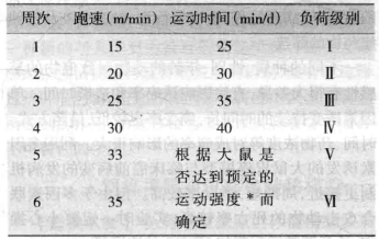 注:*,預(yù)定的運(yùn)動(dòng)強(qiáng)度是指:①大鼠連續(xù)10秒停在跑臺(tái)后1/3,聲電刺激仍止步不能向前;②大鼠連續(xù)3次臀部碰到籠具后壁并出現(xiàn)神情疲倦、腹垂位、垂頭、眼充血、呼吸急促、目光遲鈍、尾尖下垂等
