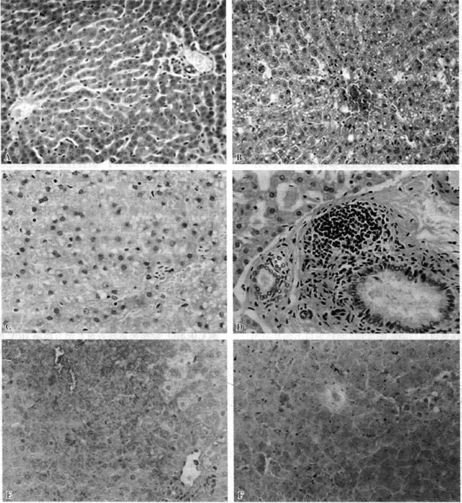 注:A.對照組:正常肝組織(H&E×400);B-F.樹韻感染HCV后肝臟病理學改變;B.脂肪變性、膽汁淤積(H&E×200);C.肝細胞空泡樣變性(H&E×400); D.膽管損傷,伴匯管區(qū)慢性炎細胞浸潤(H&E×200);E.免疫組化HCV抗原胞質(zhì)陽性(×400);F.免疫組化HCV抗原胞質(zhì)片灶狀陽性(×200)